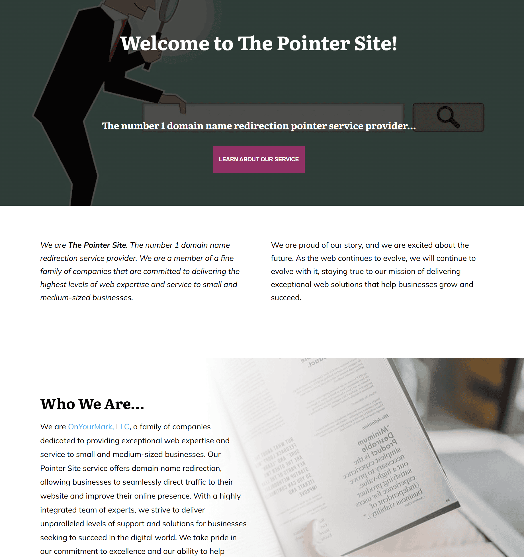 There are many reasons to choose The Pointer Site for your domain name redirection needs. First and foremost is our parent company, OnYourMark.com LLC. We are a family of companies that work together to provide unparalleled web expertise and service to small and medium-sized businesses.
